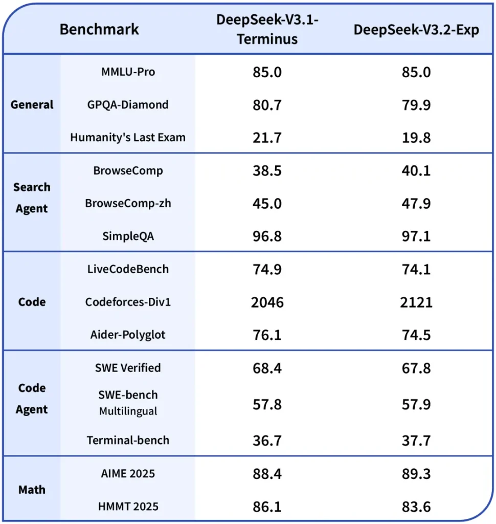 En otras palabras, se duplica la eficiencia para tareas de largo alcance sin degradar el desempeño: los benchmarks públicos han demostrado que V3.2-Exp logra métricas virtualmente idénticas a V3.1-Terminus tras introducir la atención dispersa.
